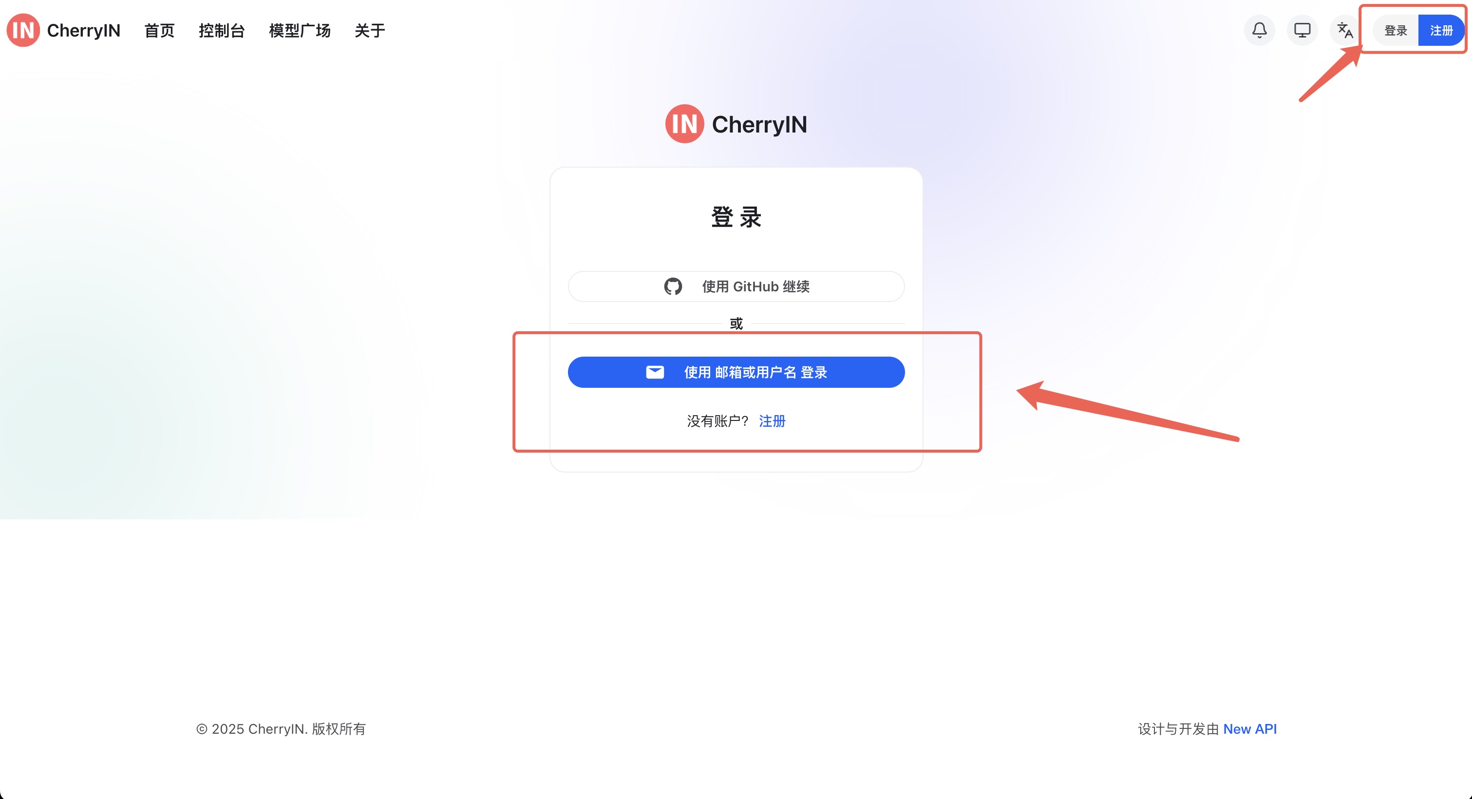 首先,您需要注册一个 CherryIN 账户。请点击首页右上角的 “注册” 按钮。