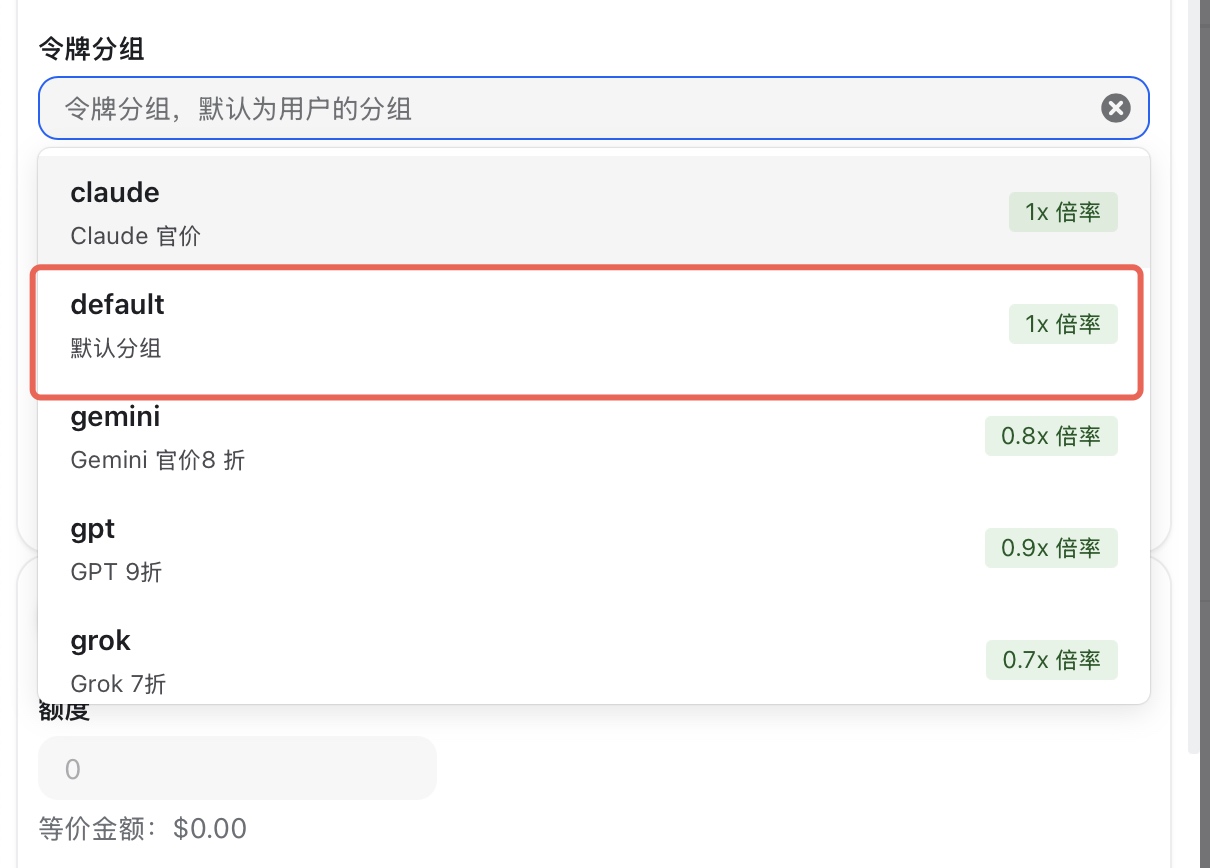 default分组下创建一个 Key。 - 优点: 可以直接调用站内 所有模型,无需额外配置,最为方便。